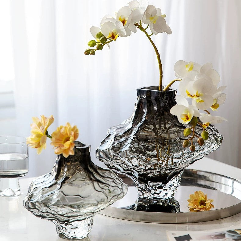 A sculptural glass vase that looks like hand-shaped water caught in motion. The thick, rippled glass body widens into an organic, rocky form, then tapers to a narrow mouth that holds stems in place.